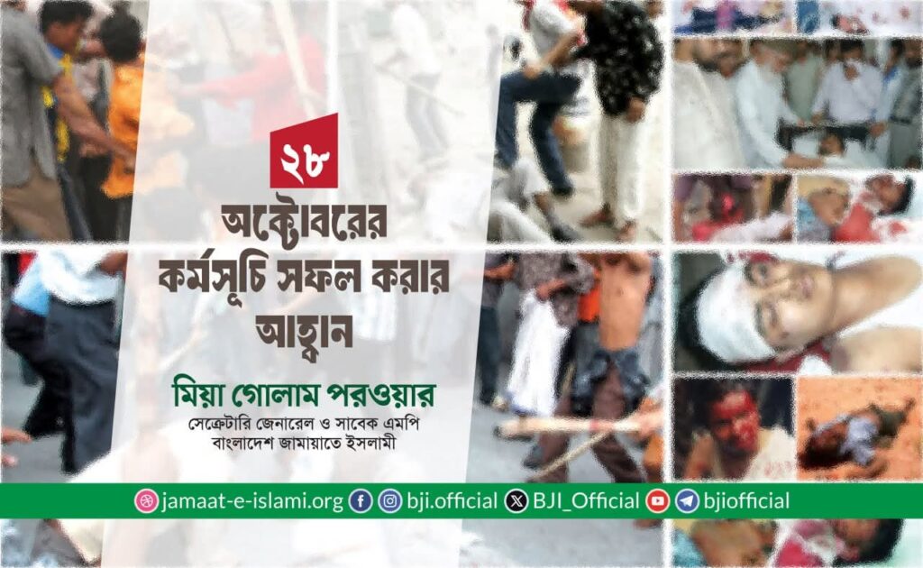 আগামীকাল ২৮ অক্টোবর (মঙ্গলবার) পূর্ব ঘোষিত কর্মসূচি সর্বাত্মকভাবে সফল করার জন্য দেশবাসীর প্রতি আহ্বান জানিয়ে বাংলাদেশ জামায়াতে ইসলামীর সেক্রেটারি জেনারেল সাবেক এমপি অধ্যাপক মিয়া গোলাম পরওয়ার ২৭ অক্টোবর এক বিবৃতি দিয়েছেন।